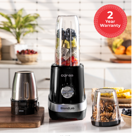 The Cüraa by YFL Home BlendLab Mixer Grinder is a compact yet powerful 400W blender engineered for modern kitchens. It comes with India’s first stainless steel dry grinding jar, designed to handle masalas, nuts, and herbs with ease—without the foggy mess of plastic jars.Equipped with a copper motor running at 18,000–24,000 RPM, dual-speed settings, and a pulse function, it delivers precision blending and grinding, whether you’re making smoothies, chutneys, purees, or dry masalas.Safety and stability are built-in with its smart jar locking system (operates only when locked) and four anti-slip suction feet to keep it steady during use. The detachable jars are easy to clean, and its compact footprint makes it perfect for small kitchens.✨ Why You’ll Love It:Versatile Use – Smoothies, chutneys, dry spices, dips, sauces, and more.Powerful & Safe – Copper motor with smart overload protection and jar lock.First-of-its-kind – Stainless steel jar for dry grinding spices and herbs.Everyday Convenience – Easy to clean, compact size, secure suction feet.Reliable – Backed by a 2-year warranty.Includes 3 jars & lids:700ml Transparent Jar with Sipper Lid (smoothies & shakes)300ml Stainless Steel Jar (dry grinding masalas & herbs)300ml Transparent Jar with Storage Lid (chutneys, sauces, dips)Perfect for those who want a multi-tasking blender + grinder that’s compact, durable, and stylish for everyday Indian kitchens.