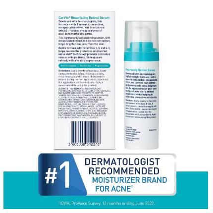 Developed with dermatologists, CeraVe Resurfacing Retinol Serum for post-acne marks and pores, this gentle yet effective formula - with three essential ceramides, soothing niacinamide, encapsulated retinol, and licorice root extract - helps smooth skin's texture by reducing the appearance of post-acne marks, minimizing the look of pores and improving your skin’s surface. . This lightweight and fast-absorbing resurfacing serum for acne helps restore even skin tone and promote a healthy-looking complexion.