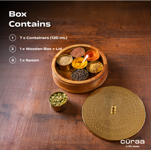 Name: CÜRAA by YFL HOME Acacia Wood Spice Box with Spoon Type: Masala Box / Spice Storage Container Material: Acacia Wood + Gold-finished Stainless Steel Lid Colour: Natural Wood with Gold Finish Capacity: 840 ML (7 containers × 120 ML each) Features: 7 detachable canisters, spoon included, handcrafted, durable, rustic + modern design Care: Wipe with soft damp cloth, dry immediately, keep away from moisture & sunlight Country of Origin: India