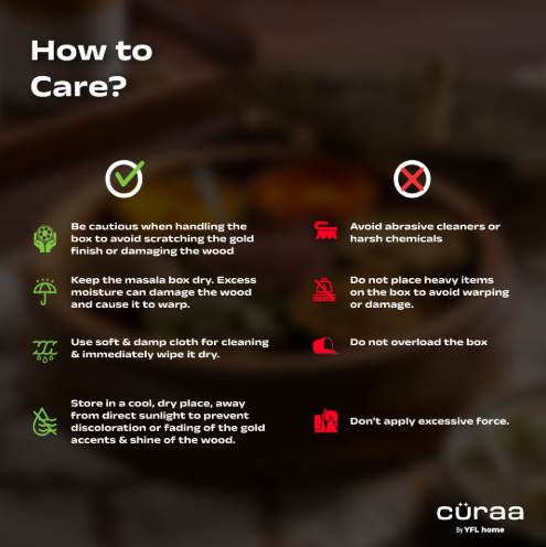The CÜRAA by YFL HOME Acacia Wood Masala Dani is where craft meets culture. Handcrafted by skilled Indian artisans, this spice box blends age-old tradition with modern design. Made from premium acacia wood and topped with a gold-finished stainless steel lid, it’s a stylish yet durable way to keep your spices fresh and organized.