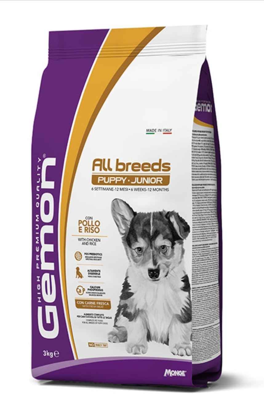 GEMON ALL BREEDS PUPPY AND JUNIOR WITH CHICKEN AND RICE is a complete pet food for puppy dogs of every size. The formulation is characterised by topquality ingredients like chicken, a source of essential nutrients, and rice, a source of carbohydrates. The recipe is made highly digestible thanks to the extrusion process. A balanced diet with prebiotics, such as fructo-oligosaccharides (FOS),and beet pulp, source of insoluble fibres to support the regular functioning of the intestinal tract. It contains fresh meat for optimal palatability and a balanced calcium and phosphorus ratio for regular growth. It also contains yucca schidigera to limit intestinal odors and brewer’s yeast for bushy coat. No added artificial dyes and preservatives.