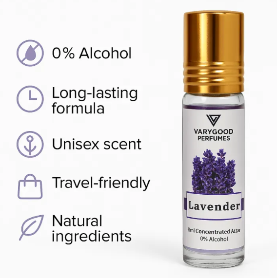 Lavender Volume: 8ML Type: Fabric Roll On Ingredients Lavender: A calming and aromatic floral note known for its soothing, fresh, and slightly herbal scent. It brings a sense of relaxation, clarity, and balance—perfect for everyday tranquility. Woody Undertones: Soft cedarwood and herbal hints complement the floral body, giving the fragrance depth and a grounding, natural feel. Musk: A clean, smooth base that enhances the longevity and elegance of lavender, leaving a subtle and comforting trail. Lavender is a serene and refreshing attar crafted for those who value calm and simplicity. Its blend of floral freshness with woody softness and gentle musk makes it perfect for daily wear, meditation, or bedtime relaxation. Long-lasting on both skin and fabric, it brings peaceful energy wherever you go. How to Apply Roll-On Perfume On Body: Apply on pulse points – Wrists, Behind Ears, Neck, Collarbones, Inner Elbows & Behind Knees. On Clothes: Dab lightly on hidden areas like inner collar, cuffs, or scarf. Use on natural fabrics (cotton, wool, linen) for optimal scent absorption and retention.