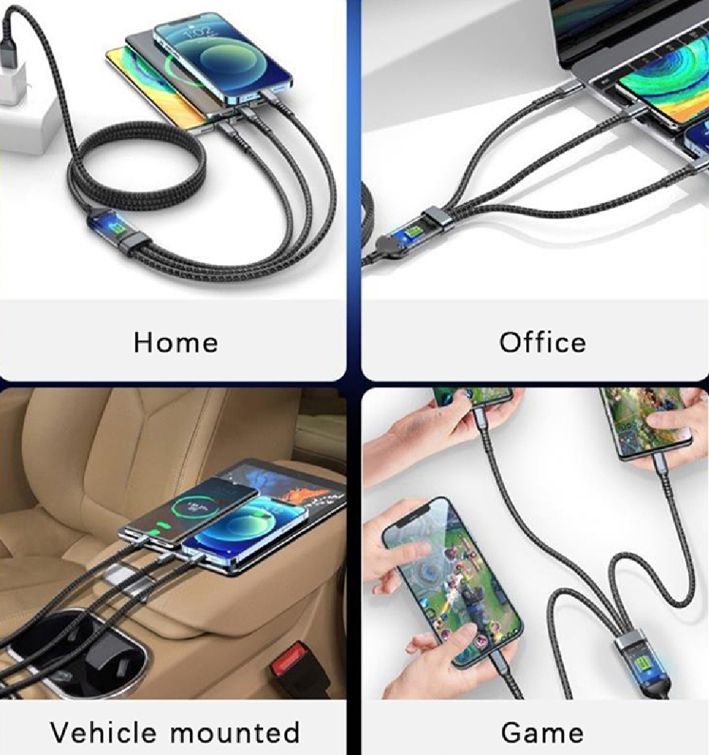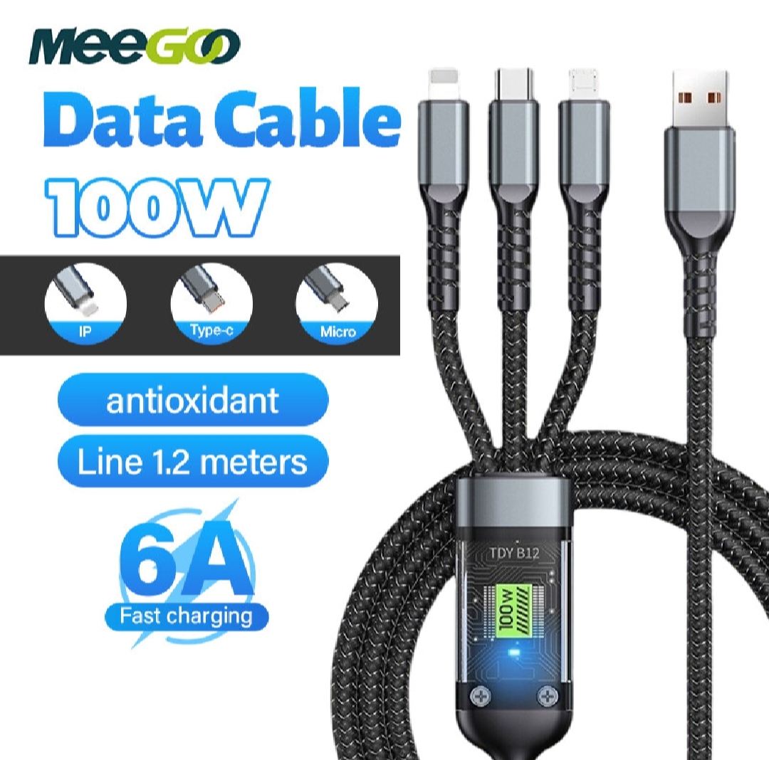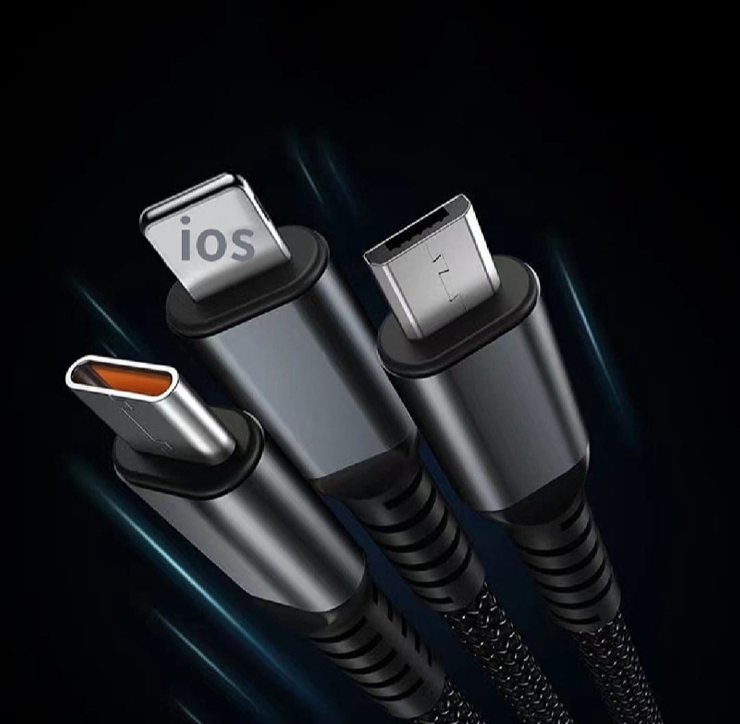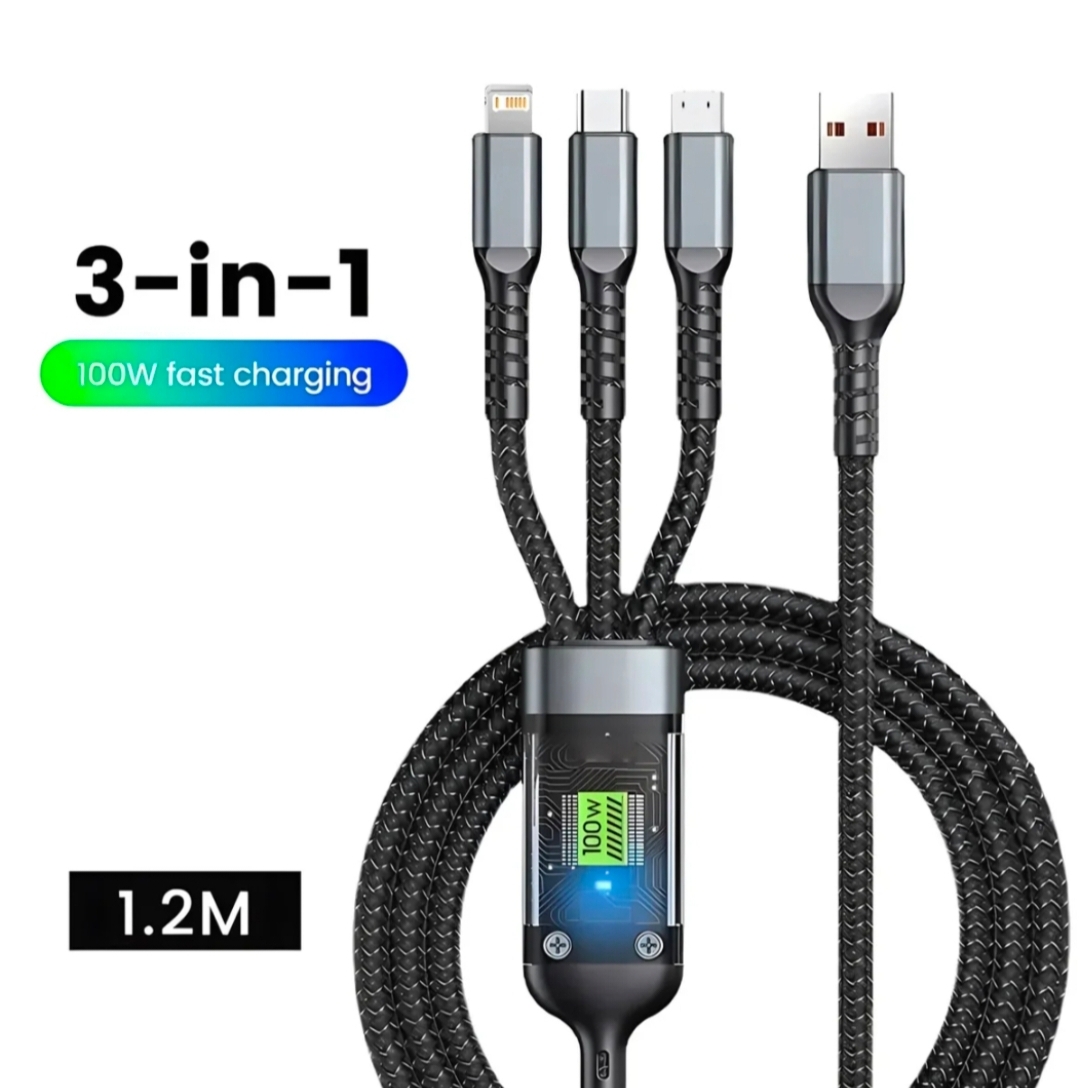 Highlights • Fast USB Cable charger 3 in 1 Multi charging TOOW Type C Micro USB Lighting Compatible with all devices Strong and durable nylon braided 1.2 meter Cable Only • 3 in 1 Charging Cable This multi charging cable with 3 USB ports is a great solution for all your devices. Cable features Type C, lighting, Micro connectors with fast charger 100W power and able to charge three devices at the same time. Durability and Quality This 3 in 1 charger cable is nylon braided with high quality aluminum casing holding a transparent sensor and night light. Cable is strong and flexible at the same time making it durable and strong. • 1.2 Meter approx.