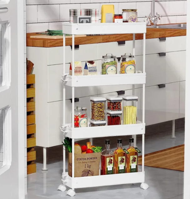 Product Description : Keep your kitchen, laundry room, bathrooms, and closets neatly organized with these functional 4 tier slim storage cart organizer. Store and organize cleaning supplies, spice bottles, medicine bottles, jars, cans, vitamins, and many more items. Suitable for closets, kitchens, bathrooms, garages, laundry rooms, offices, or any other room. 4 tier shelves can be adjusted to 2 or 3 shelves for a wide range of applications. 4 side hooks included foe extra storage. 4 tier selves are made of durable high-quality plastic. With stainless steel polls.