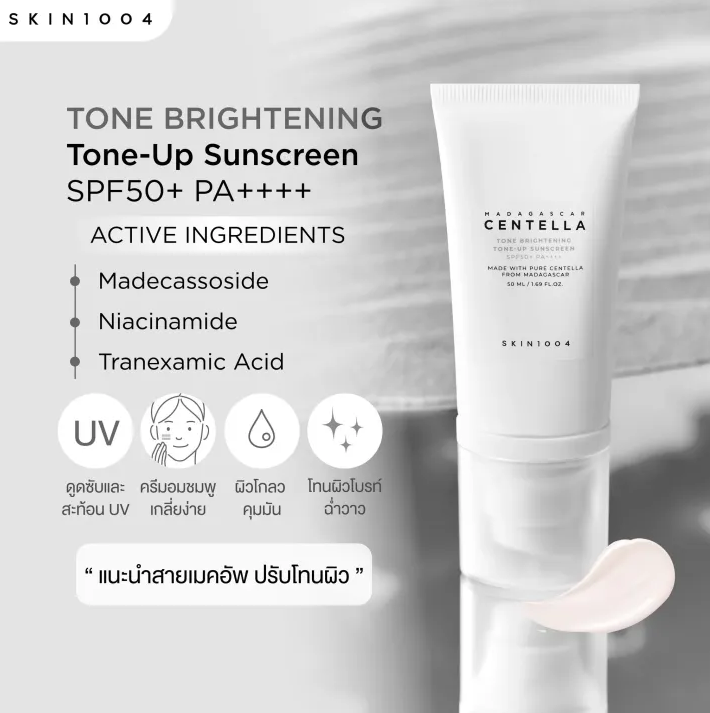 SKIN1004 Madagascar Centella Tone Brightening Tone-Up Sunscreen is an innovative sunscreen that combines high sun protection with skin lightening, giving you a radiant and vibrant appearance. This sunscreen contains Centella Asiatica extract from Madagascar known for its soothing and rejuvenating properties, as well as Niacinamide and Tranexamic Acid which help reduce pigmentation and even out skin tone. Its lightweight formula absorbs quickly without leaving any greasy residue, making it suitable for all skin types, including sensitive skin.