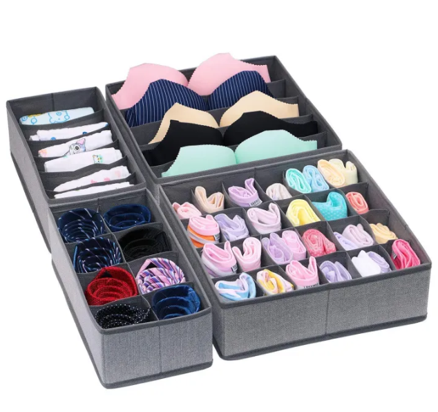 Small items often get lost in cabinets or drawers, but with these 4 drawer organizer boxes, you can keep everything neatly lined up and easily accessible without digging through a messy pile. This set of collapsible storage boxes offers a stylish, lightweight solution for various personal storage needs, perfect for use in closets or drawers and easily foldable for storage when not in use. Ideal for organizing socks, ties, underwear, bras, lingerie, toys, baby clothes, T-shirts, towels, and more, these organizers are made from moisture-proof, breathable non-woven polypropylene fabric, ensuring durability and a clean look with meticulous stitching. Each compact bin is compact enough making them easy to fit on cupboard shelves or any convenient space.