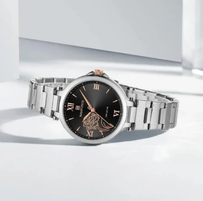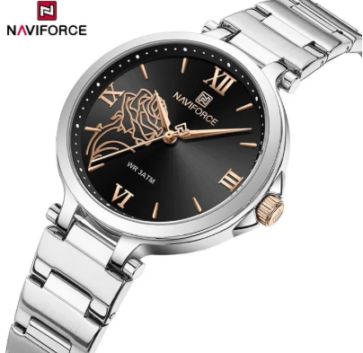 NAVIFORCE NF5060 Women's Fashion Rose Relief Roman Numeral Stainless Steel Watch - Black/Silver