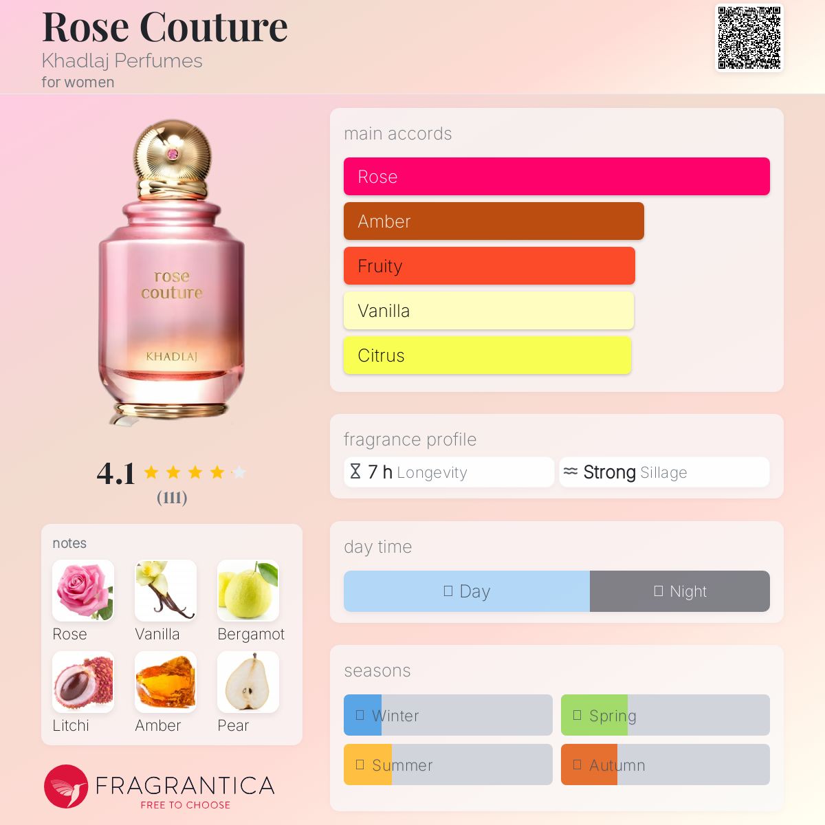 Rose Couture by Khadlaj Perfumes is a Floral Woody Musk fragrance for women. Rose Couture was launched in 2022. Top notes are Bergamot, Lychee and Pear; middle notes are Turkish Rose, Incense and Agarwood; base notes are Vanilla, Amber and Cedarwood.