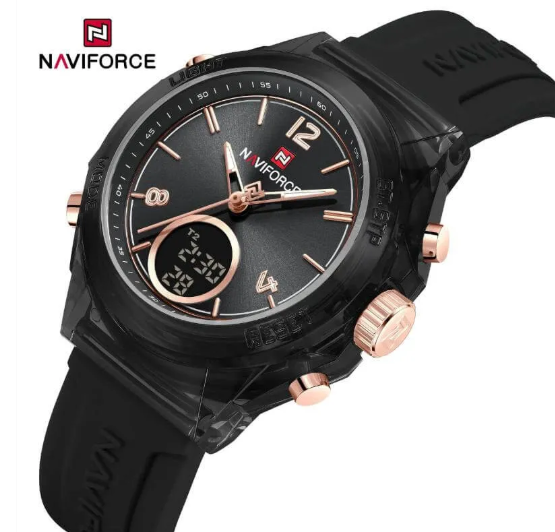 Brand Name : NaviForce Model Number : NF7109 Case Material : Polycarbonate Clasp Type : Buckle Movement : Y121F4 (Seiko Instruments Inc.) Case Shape : Round Dial Diameter : 35 mm Band Width : 18 mm Case Thickness : 15 mm Band Length : 230 mm Weight : 42 g Band Material Type : Silicon Strap Dial Window Material Type : Hardened Mineral Glass Features : Week Display, Luminous