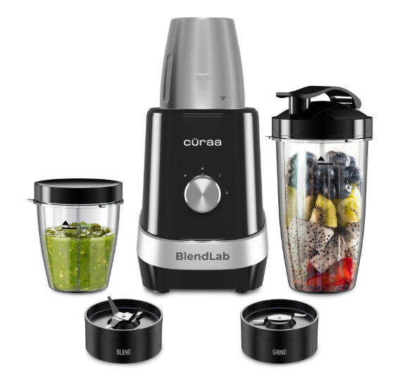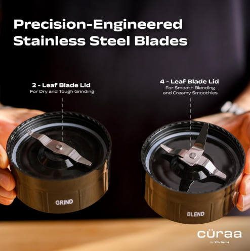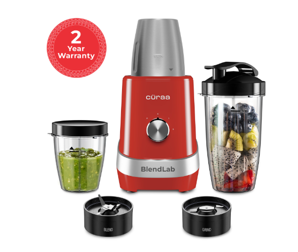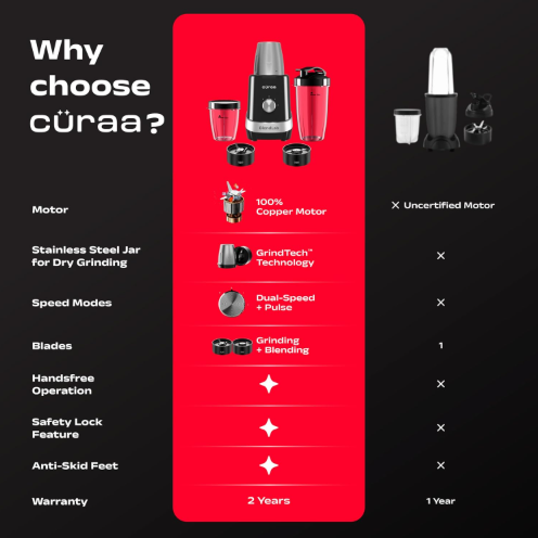 The Cüraa by YFL Home BlendLab Mixer Grinder is a compact yet powerful 400W blender engineered for modern kitchens. It comes with India’s first stainless steel dry grinding jar, designed to handle masalas, nuts, and herbs with ease—without the foggy mess of plastic jars.Equipped with a copper motor running at 18,000–24,000 RPM, dual-speed settings, and a pulse function, it delivers precision blending and grinding, whether you’re making smoothies, chutneys, purees, or dry masalas.Safety and stability are built-in with its smart jar locking system (operates only when locked) and four anti-slip suction feet to keep it steady during use. The detachable jars are easy to clean, and its compact footprint makes it perfect for small kitchens.✨ Why You’ll Love It:Versatile Use – Smoothies, chutneys, dry spices, dips, sauces, and more.Powerful & Safe – Copper motor with smart overload protection and jar lock.First-of-its-kind – Stainless steel jar for dry grinding spices and herbs.Everyday Convenience – Easy to clean, compact size, secure suction feet.Reliable – Backed by a 2-year warranty.Includes 3 jars & lids:700ml Transparent Jar with Sipper Lid (smoothies & shakes)300ml Stainless Steel Jar (dry grinding masalas & herbs)300ml Transparent Jar with Storage Lid (chutneys, sauces, dips)Perfect for those who want a multi-tasking blender + grinder that’s compact, durable, and stylish for everyday Indian kitchens.