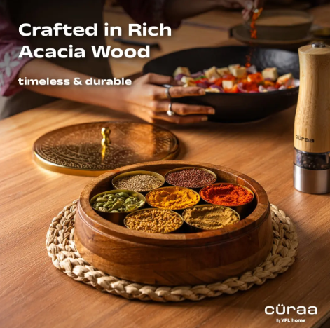 The CÜRAA by YFL HOME Acacia Wood Masala Dani is where craft meets culture. Handcrafted by skilled Indian artisans, this spice box blends age-old tradition with modern design. Made from premium acacia wood and topped with a gold-finished stainless steel lid, it’s a stylish yet durable way to keep your spices fresh and organized.
