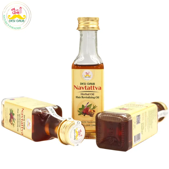 Desi Grub Navtattva Hair Oil is a premium hair care solution designed to nourish, rejuvenate, and protect your hair and scalp. This unique oil combines the benefits of potent natural ingredients like Apricot Kernel Oil, Castor Oil, Black Seed Oil, Hibiscus Oil, and an array of essential oils—Sage, Peppermint, Rosemary, Nettle, and Lavender—further enhanced with traditional Himalayan herbs.