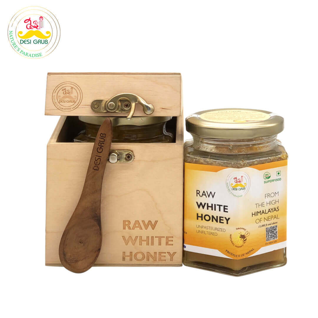 The Desi Grub Raw White Honey Gift Box, packed in an elegant wooden box and accompanied by a Sheesham wood spoon, is the perfect representation of natural luxury. Whether as a gift for a loved one or a treat for yourself, this honey offers an unparalleled experience of the Himalayan wilderness, bringing with it a legacy of purity, tradition, and health.