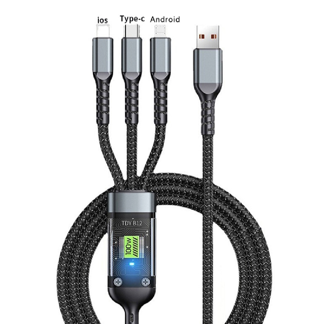 Highlights • Fast USB Cable charger 3 in 1 Multi charging TOOW Type C Micro USB Lighting Compatible with all devices Strong and durable nylon braided 1.2 meter Cable Only • 3 in 1 Charging Cable This multi charging cable with 3 USB ports is a great solution for all your devices. Cable features Type C, lighting, Micro connectors with fast charger 100W power and able to charge three devices at the same time. Durability and Quality This 3 in 1 charger cable is nylon braided with high quality aluminum casing holding a transparent sensor and night light. Cable is strong and flexible at the same time making it durable and strong. • 1.2 Meter approx.