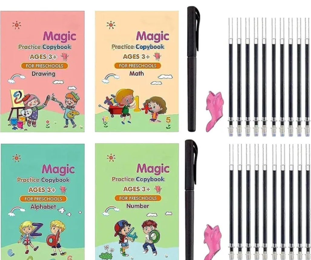 4 pcs Sank Magic Practice Copy Book For Math,Number,Alphabet and Drawing Practice Copy Book 1pen, 10 refill