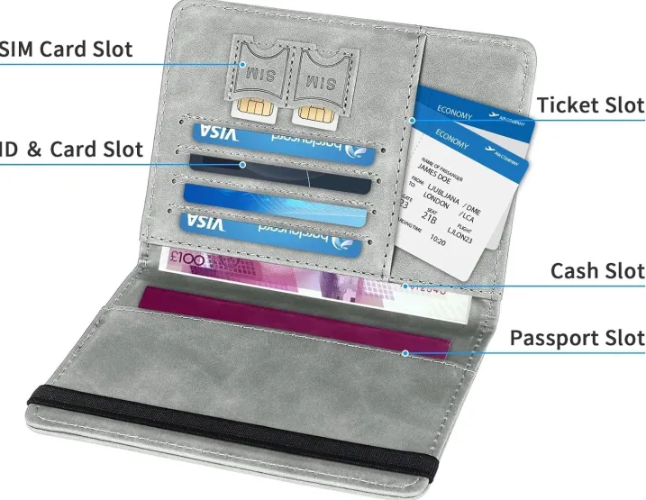 Practical Passport Wallet : passport holder has 4 card slots that can hold at least 4 credit cards, 1 passport slot, 1 ticket slot, 1 bill slot, and 2 SIM card slots. The passport cover also doubles as a travel wallet, where you can store identification documents, receipts, credit cards, cash, tickets or boarding passes. This makes it easy to access information during boarding and transit.