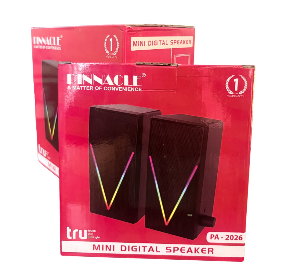 Bring your music to life with the Pinnacle Mini Digital Speaker. Designed with tru sound technology and RGB lighting effects, it delivers clear and powerful audio while adding a stylish touch to your space. Compact and convenient, this speaker is perfect for desktops, laptops, and everyday entertainment.