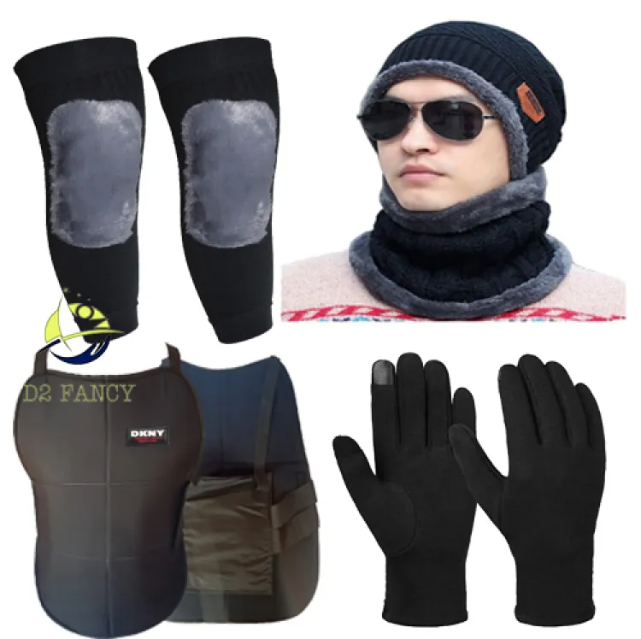 Enhance your winter wardrobe with the Pack Of 4 Winter Combo Sets for Men. This set includes a sleeveless chest guard, a topi, a neck warmer, and a pair of gloves, providing comprehensive protection during mild winter days. With a solid pattern and cozy design, this combo set offers both style and comfort. The free size design accommodates chest sizes from 32 to 42 inches, making it suitable for a wide range of individuals.