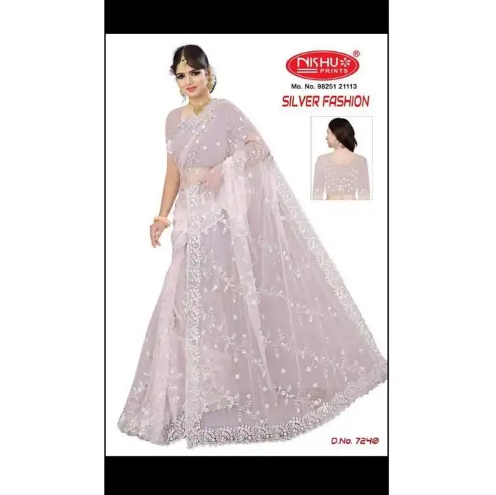 The saree is made of net, which is a delicate fabric known for its sheer quality and intricate weaving technique.