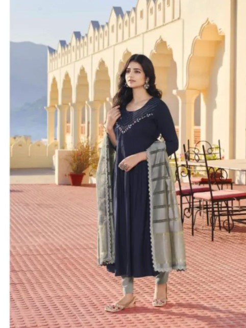 This outfit features a solid A-line dress with a regular style. The dress has a round neck and three-quarter regular sleeves. It falls at a calf length with a straight hemline. The dress is made from fancy machine weave fabric, adding a touch of elegance to the design.
