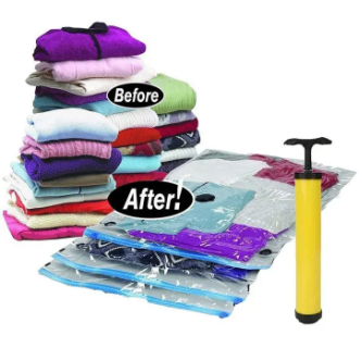 Taking every bit of air from the bags shrinks blankets and quilts to 80% and clothes and other goods to 60% paving space for more storage.