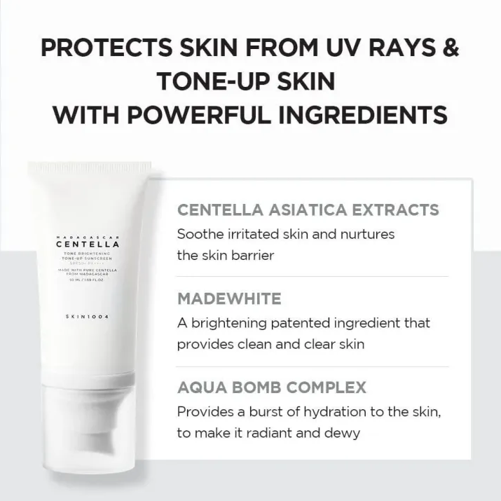 SKIN1004 Madagascar Centella Tone Brightening Tone-Up Sunscreen is an innovative sunscreen that combines high sun protection with skin lightening, giving you a radiant and vibrant appearance. This sunscreen contains Centella Asiatica extract from Madagascar known for its soothing and rejuvenating properties, as well as Niacinamide and Tranexamic Acid which help reduce pigmentation and even out skin tone. Its lightweight formula absorbs quickly without leaving any greasy residue, making it suitable for all skin types, including sensitive skin.