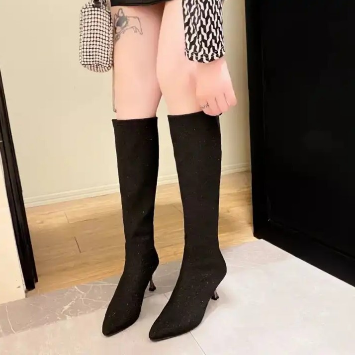 Product details of Stretch Glitter Socks Boots Women Slip On Thin High Heels Fashion Pointed Toe Long Tube Knee-high Botines