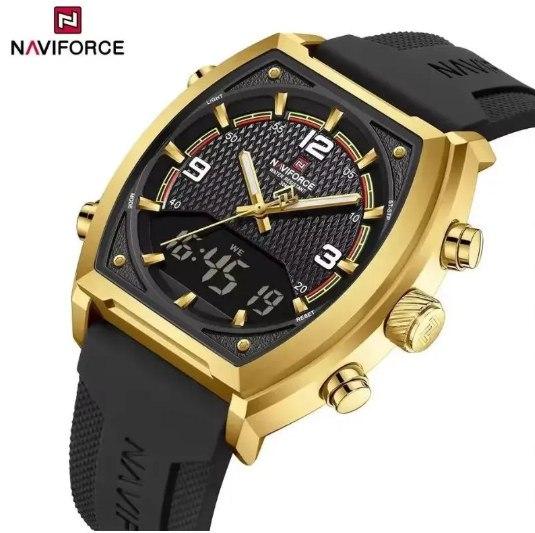 NaviForce NF9242 Men's Fashion Tonneau Shape Dial Dual Time Multifunction Silicon Strap Watch - Golden/Black